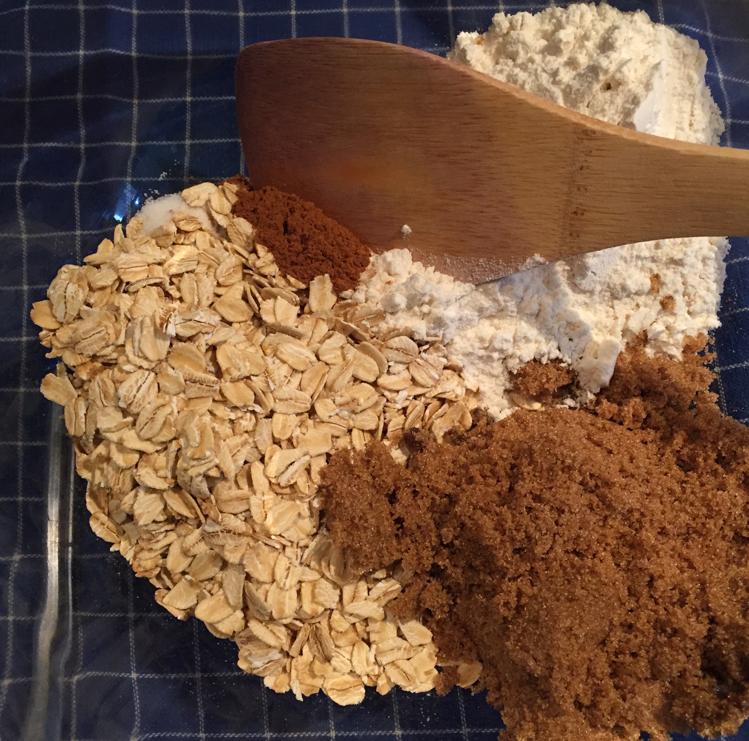 While the filling is sitting, start on the crust- adding dry ingredients first. Mix together 2 cups oats, 1/2 cup whole wheat flour, 1 tablespoon cinnamon, 2 tsp salt, 1/3 cup brown sugar, and 1/3 cup white sugar.